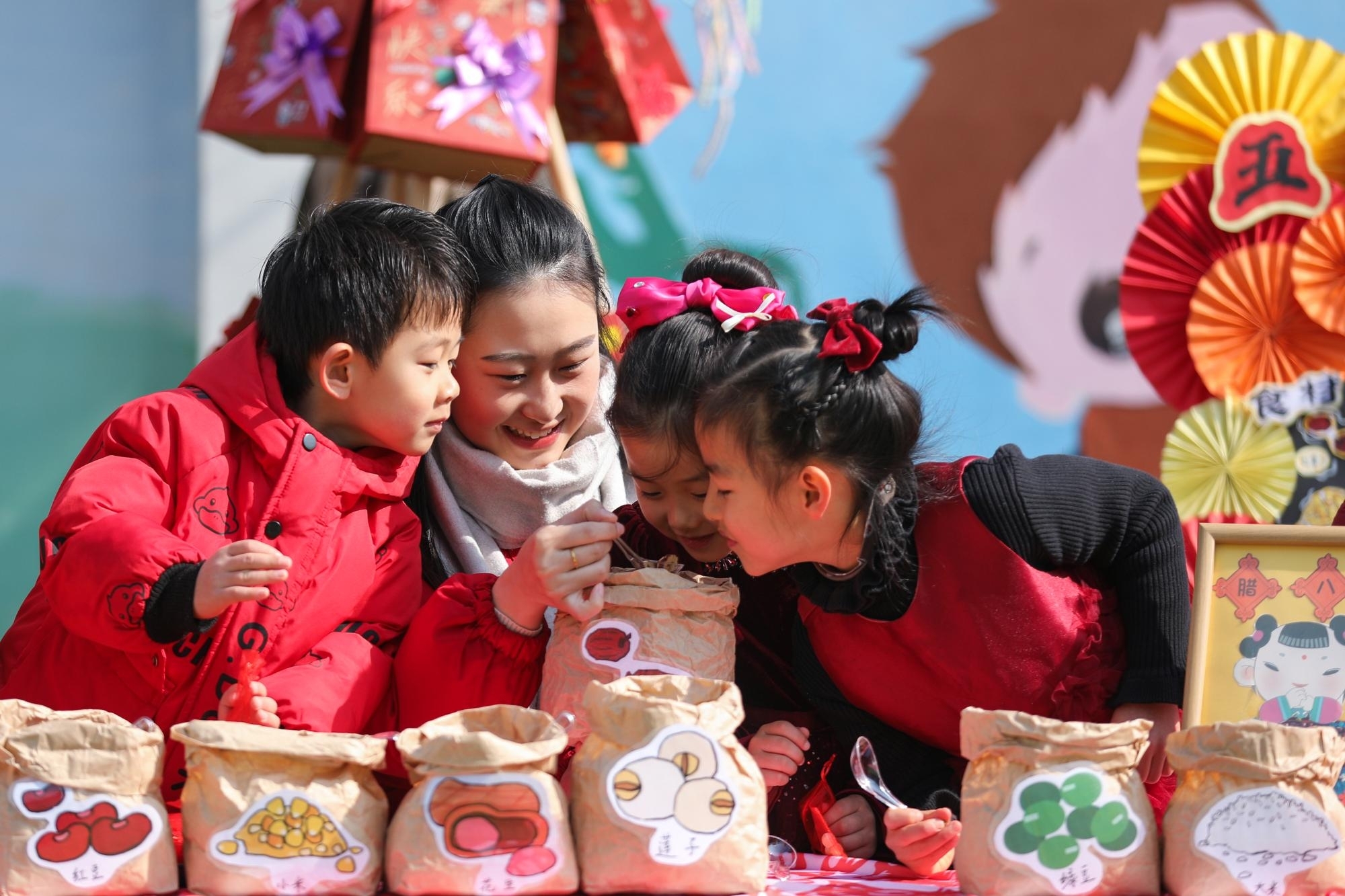 1月23日,黄山市示范幼儿园内,老师为小朋友介绍制作腊八粥的食材,讲解腊八节的相关民俗知识,迎接腊八节的到来。通讯员樊成柱摄