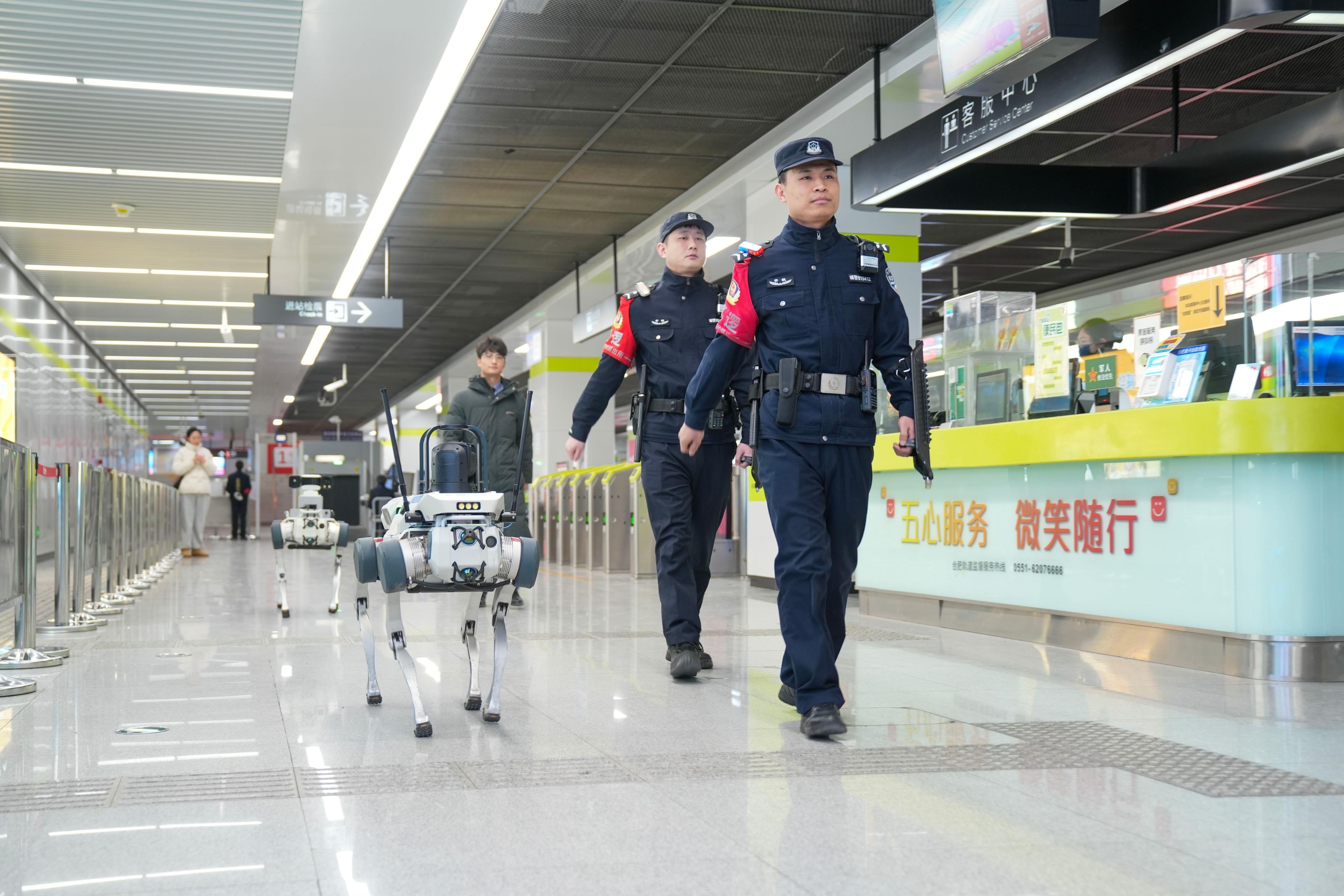 1月31日,在云谷路站,警用机器狗“靓仔”和“虎子”不时以语音提醒旅客注意安全。