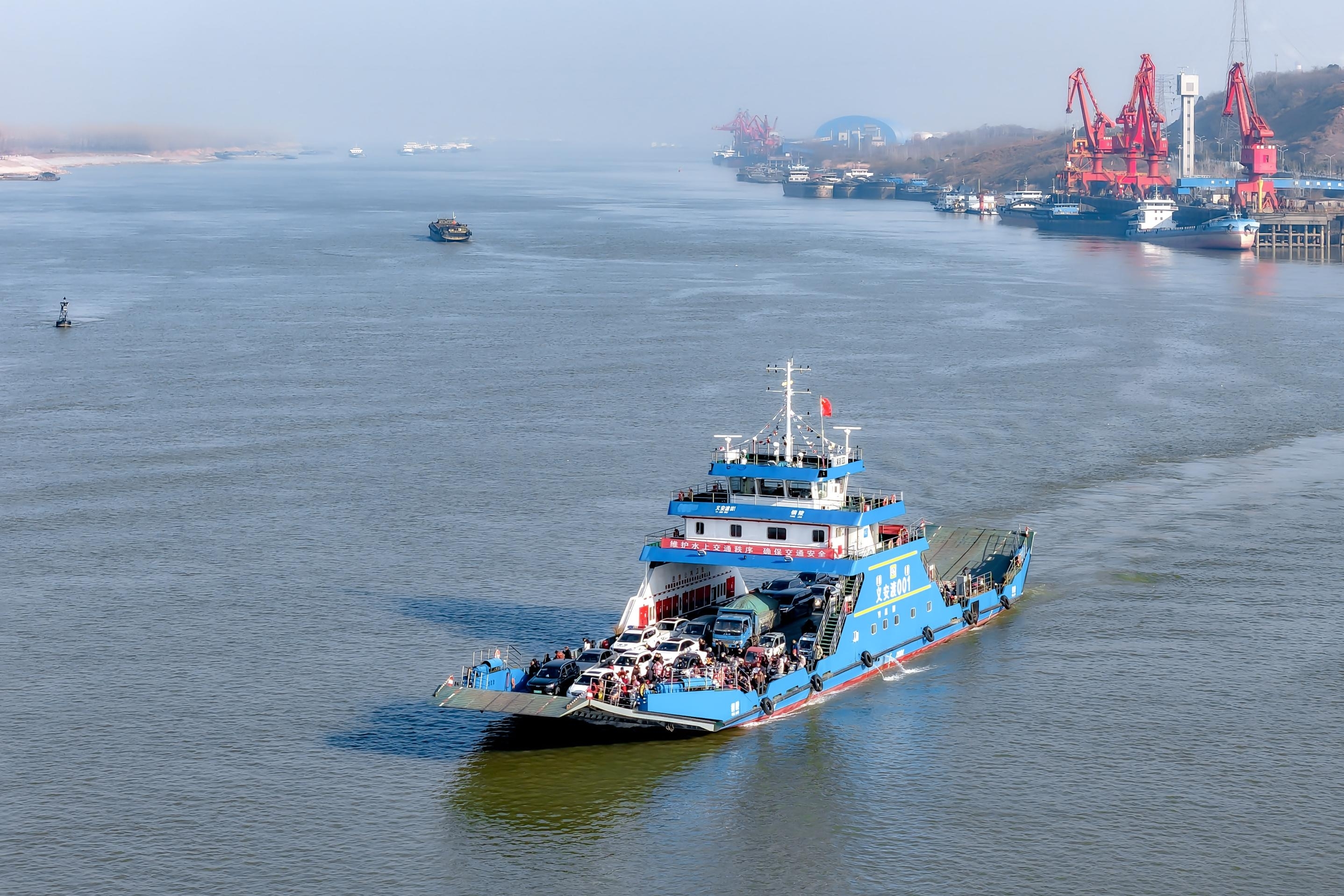 2月3日,乘客和车辆搭乘轮渡前往位于长江江心洲的铜陵市义安区老洲乡。春运期间,当地政府积极调整渡船运行时间和频率,加强渡运安全管理,保障水上春运交通安全。