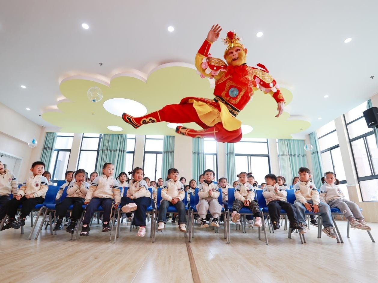 12月3日,淮北市第一幼儿园国购园的小朋友在观看戏曲《美猴王大闹天宫》。当日,该市豫剧院走进第一幼儿园国购园开展“送戏进校园”活动。