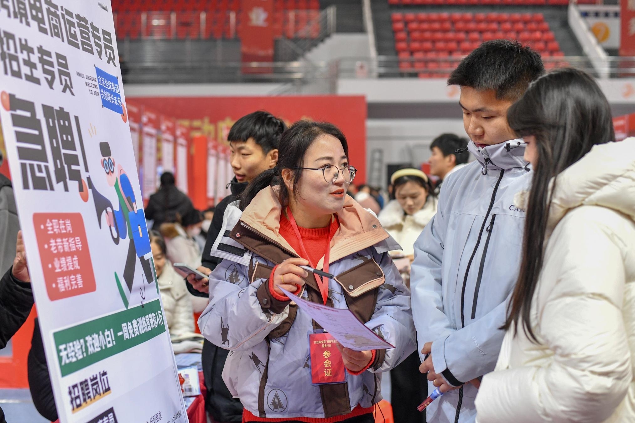 “春暖农民工”专场招聘会上,用人单位工作人员向求职者介绍招聘岗位信息。本报通讯员张刘艳摄