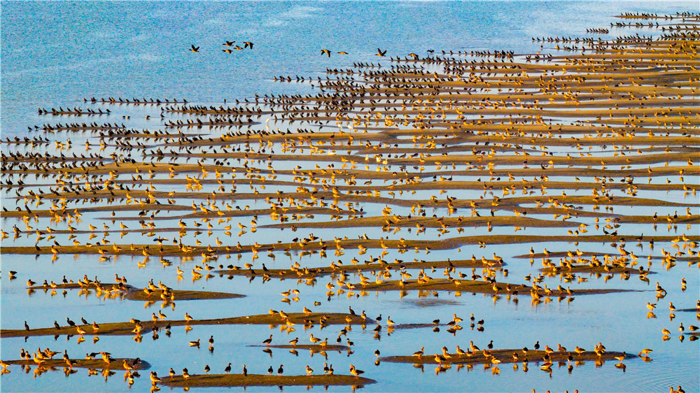 11月22日,长江安徽东流段稠林矶江滩,成群候鸟在水中休憩,勾勒出一幅灵动唯美的生态画卷。