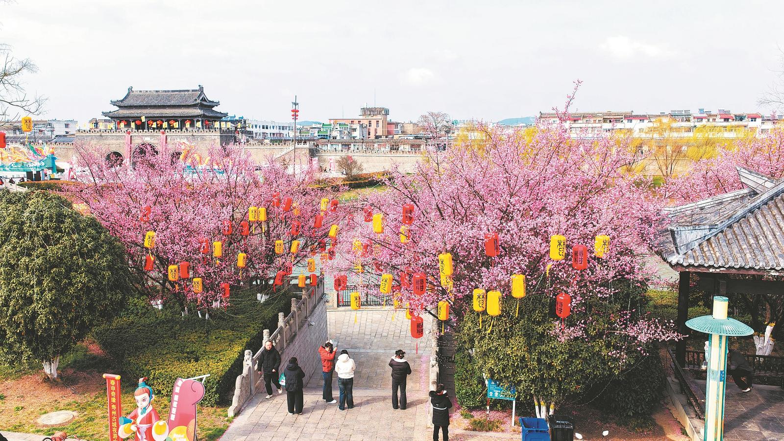 2月28日,寿县古城南门护城河畔,梅花进入最佳观赏期,吸引了众多游客前来赏花。