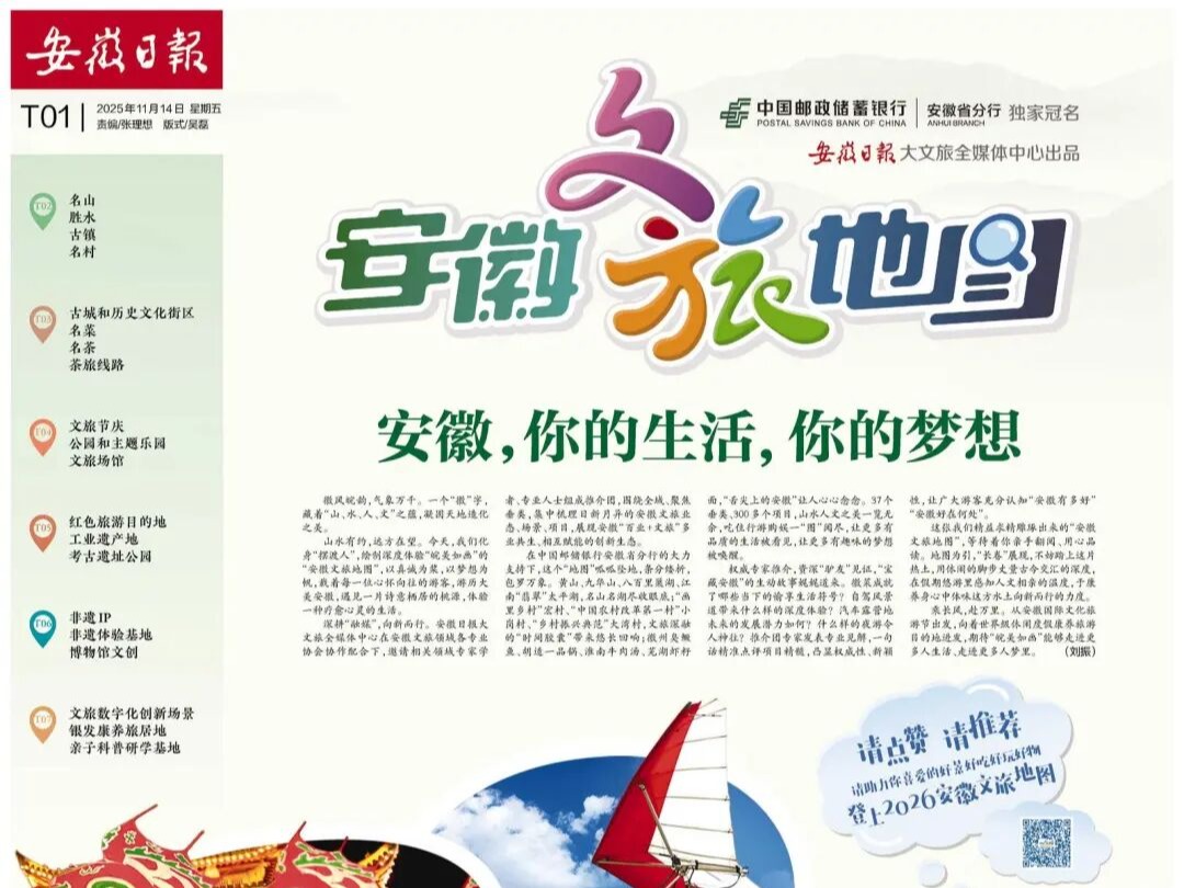 一张地图,包罗万象。“安徽文旅地图”涵盖名山、胜水、古镇、名村等37个垂类、300多个项目,山水人文之美一览无余,吃住行游购娱一“图”阅尽。权威专家、资深“驴友”发表专业见解,一句话精准点评项目精髓,凸显权威性、新颖性,让广大游客充分认知“安徽有多好”“安徽好在何处”。在中国邮政储蓄银行安徽省分行的大力支持下,“安徽文旅地图”呱呱坠地,化作一封满怀热忱的邀请函,盛邀五湖四海的游客,“按图索骥”游历大美安徽,用休闲的脚步丈量古今交汇的深度,在假期悠游里感知人文相亲的温度,在康养身心中体味这方水土向新而行的力度。