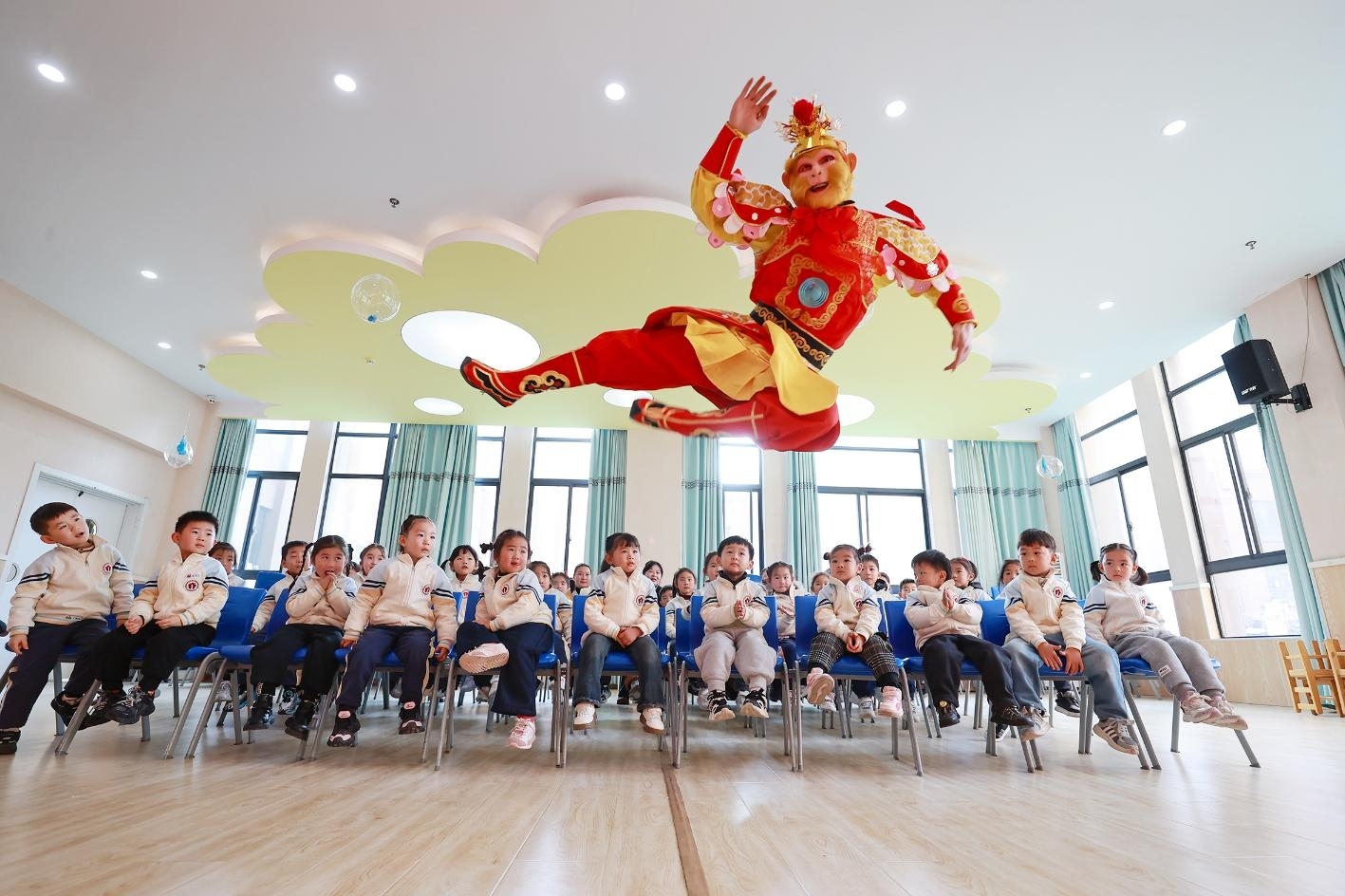 12月3日,淮北市第一幼儿园国购园的小朋友在观看戏曲《美猴王大闹天宫》。当日,该市豫剧院走进第一幼儿园国购园开展“送戏进校园”活动。