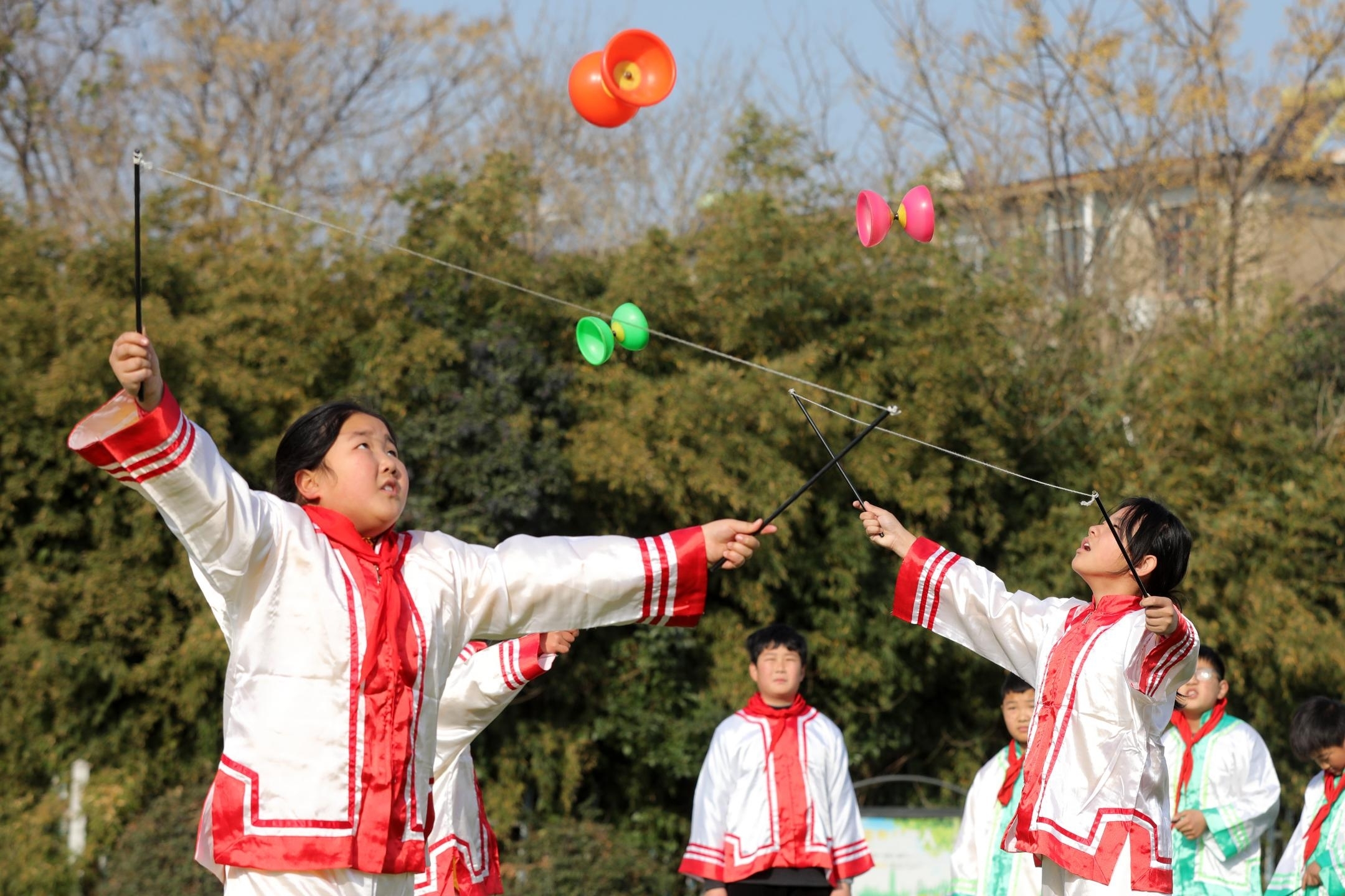 12月8日,淮北市相山区刘桥矿小学开展丰富多彩的阳光体育大课间活动,学生们在练习五禽戏、抖空竹、滚铁环、踢毽子等传统体育项目中乐享课间运动快乐。本报通讯员 万善朝 摄