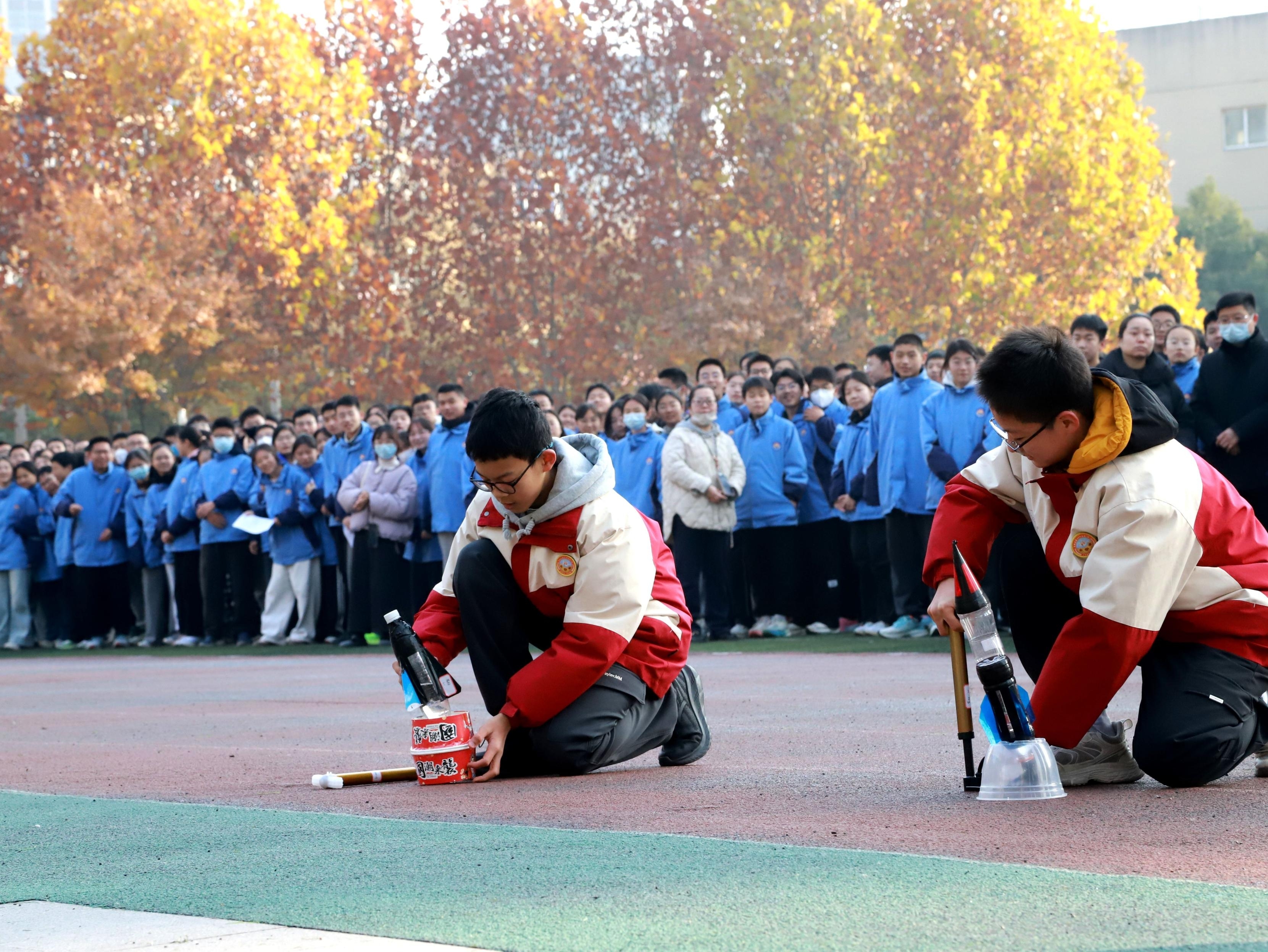 12月8日,合肥市第三十八中学北校操场上,学生们在放飞自制的水火箭。该校科学老师利用课间辅导学生制作水火箭,点燃孩子们的科技梦想。本报通讯员 闻超 摄