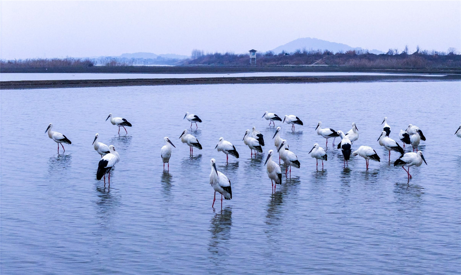 1月5日,安庆菜子湖国家湿地公园出现国家一级保护动物东方白鹳的身影。