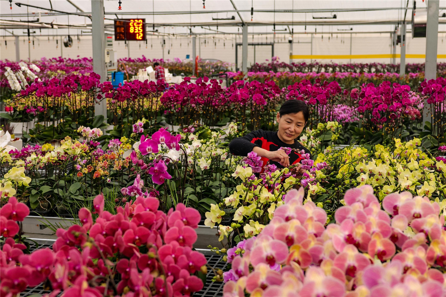 1月6日,肥西县上派镇彭圩村兰君园艺基地,工作人员在整理年宵花蝴蝶兰。兰君园艺蝴蝶兰种植基地的智能化温室大棚内,25万余株各色蝴蝶兰争奇斗艳,60万株花苗旺盛生长,迎来年宵花销售旺季。(记者 王兰兰 摄)