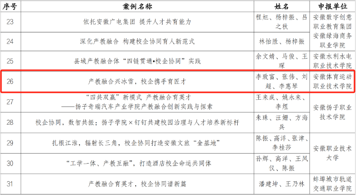 据悉,此次安徽体育运动职业技术学院校企合作案例成功入选,也为安徽冰雪运动发展打造了可复制、可推广的产教融合样板,也让更多人看到江淮冰雪运动的发展潜力,未来将吸引更多力量参与冰雪事业,让冰雪之花在皖江大地绽放得更加绚烂。